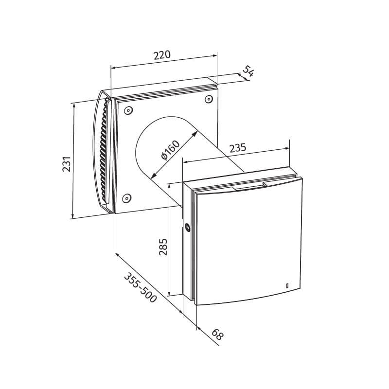 Thin wall hood allows for 160mm of the tube to sit within – this means there is a larger protrusion from the external wall. Add an extra 50mm for the optional filter.