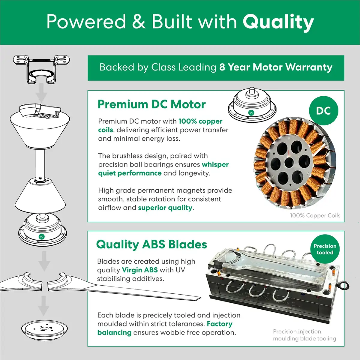 Please note: Enclosed Outdoors: Products installed at least 1.5m from the perimeter of the roof/eaves of the enclosure (to protect the product from direct or indirect rainwater or sunlight). This model utilises a DC motor. However, it has an internal converter and is, therefore, compatible with normal AC electrical systems. It cannot be connected directly to a DC power source. The fan and components must be installed by qualified persons.