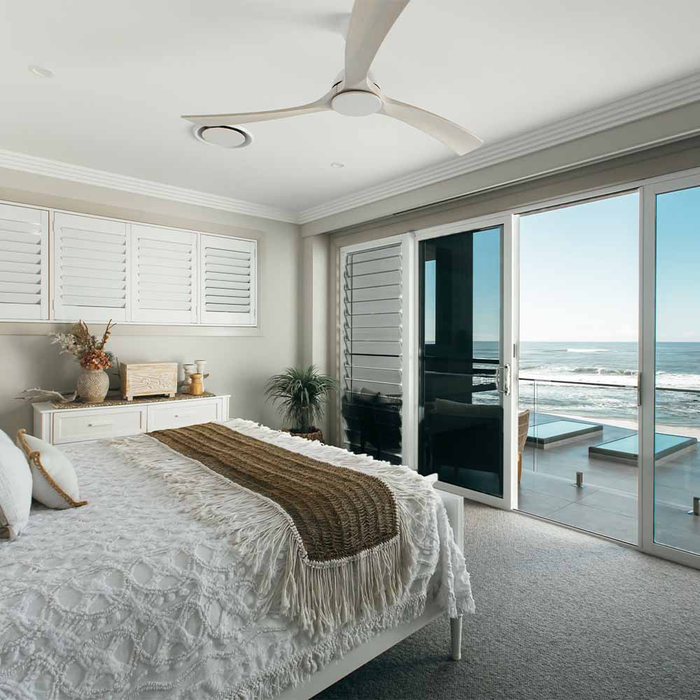 The Fanco Sanctuary features anti-corrosive metal components and solid timber blades with a protective sealer, delivering a sleek, durable finish perfect for outdoor and coastal settings.