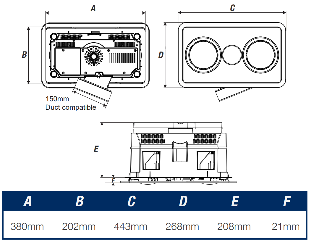 | Ductable | Yes (150mm duct diameter) |