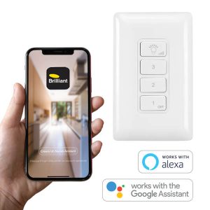 The Brilliant Smart WiFi ceiling fan remote control allows you to control your fan either from a battery powered wall control, the Brilliant Smart smartphone app, as well as from your voice with either a Google Assistant or Amazon Alexa smart home device. Simply download and setup the fan controller app on your Android or Apple smartphone or tablet, then link it to your smart home. One remote is required per fan. The kit also includes a physical wall controller if you would rather use the remote physically. The app lets you create schedules & timers to automate your home experience.